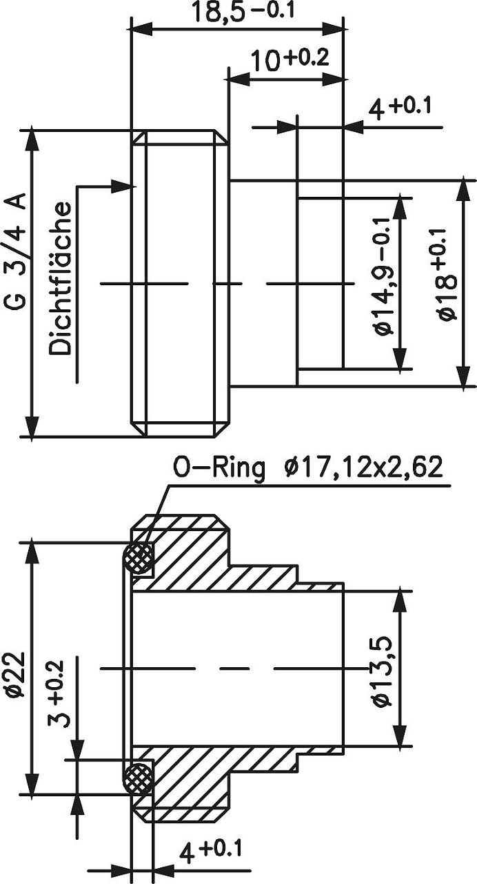 - Ms-Überwurfmutter DN 20 R (3/4“) mit O-Ring und Anlötstutzen zum Einlöten in ein Norm-Kupfer-T-Stück mit Abgang DN 15 (1/2“) im Lieferumfang