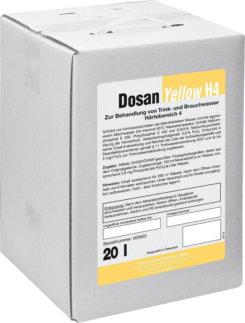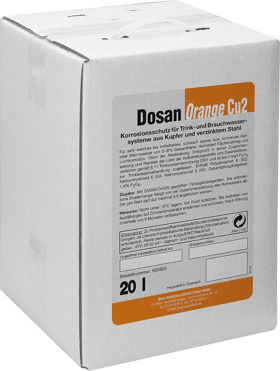 Wirkstoff: DOSAN Red H1Gebinde: 20 lMarke: BWGEinsatzbereich: Härtebereich 1 (0-7° dH)Weiches Wasser mit agressiven EigenschaftenVPE: €/StückFarbe: klarTyp: DOSAN H 1Aufgaben: Schutzschichtbildung in verzinktenund ankorrodierten Rohren