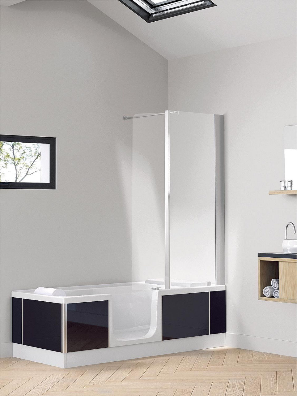 - Badewanne mit festen Abmessungen und Einstiegstür aus transparentem Glas