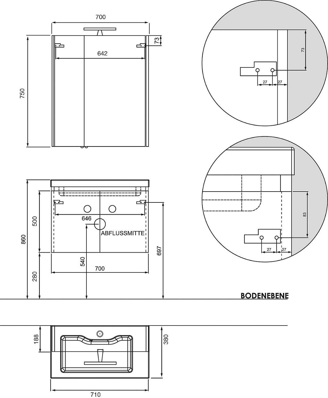 - Maße (B x H x T): 700 x 750 x 188 mm