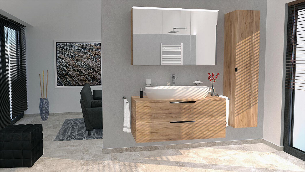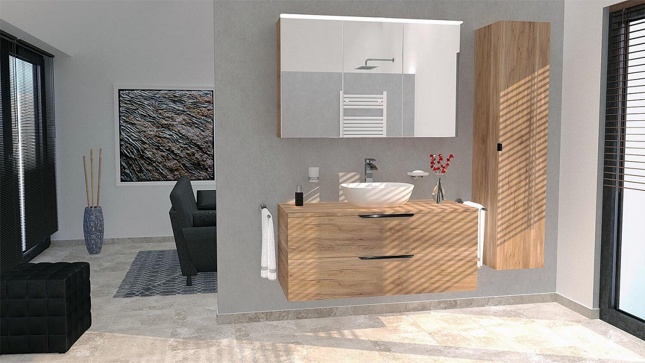 Badmöbel-Set LOSSA mit LED-Spiegelschrank Asteiche Cortina 2 Auszüge, 1 Siphonausschnitt ohne WT Breite 1200 mm