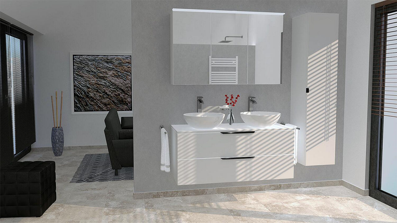 Badmöbel-Set LOSSA mit LED-Spiegelschrank weiß Hochglanz 2 Auszüge, 2 Siphonausschnitt ohne WT Breite 1200 mm