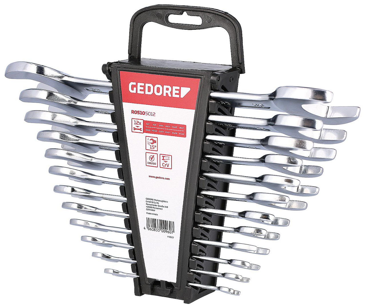 Umschaltbar: falseGesamtzahl der Werkzeuge: 8Marke: Gedore redGewicht [g]: 700Norm: DIN 3110Oberflächenschutz: verchromtselbstjustierend: falseHerstellerartikelnummer: 3300959Anzahl der Maulschlüssel: 8VPE: €/SatzSchlüsselweite [mm]: 6;22Maulstellung [°]: 15Ausführung: DoppelmaulschlüsselWerkstoff: Chrom-Vanadium StahlSW [mm]: 6x7/8x9/10x11/12x13/14x15/16x17/18x19/20x22Ratschenausführung: false-teilig: 8Verpackung: HalterungVDE geprüft: falseGekröpft: falseEAN: 4060833009591
