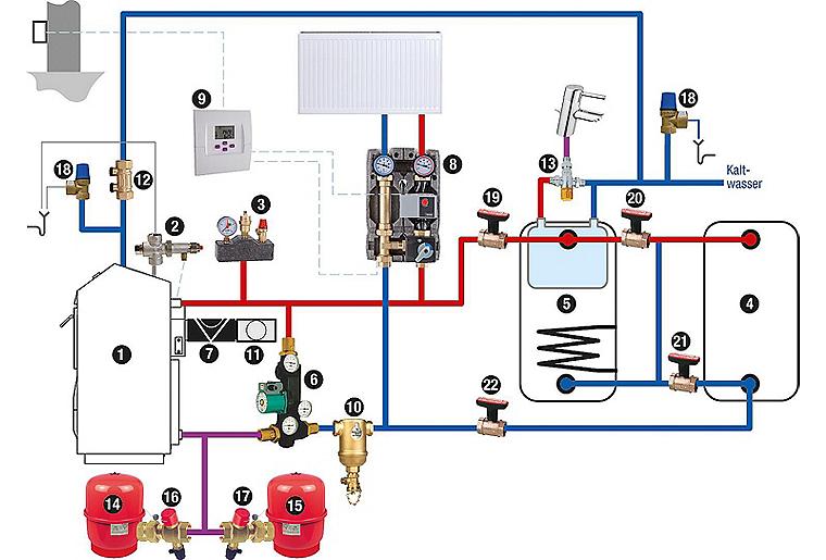 - Zur Absicherung des Warmwassers gegen Übertemperatur mit Rückschlagventilen und Schmutzfänger