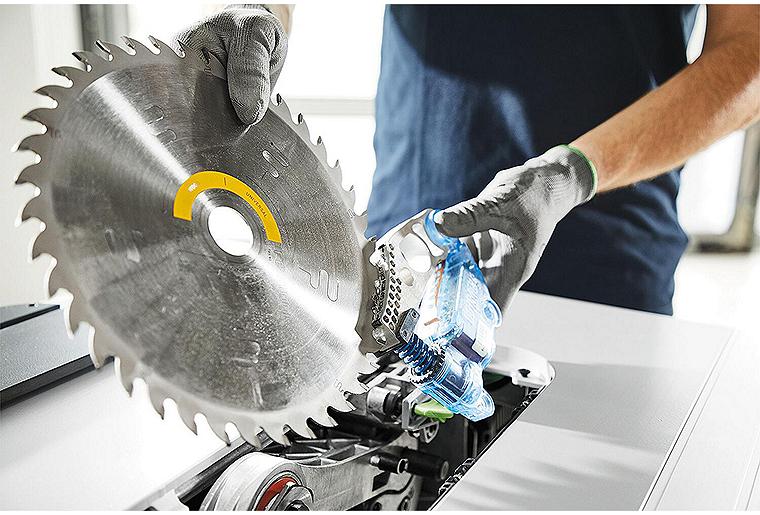 SawStopAIM Technologie: Bei Hautkontakt löst die Patrone eine vorgespannte Feder und schießt einen Alublock in das Sägeblatt