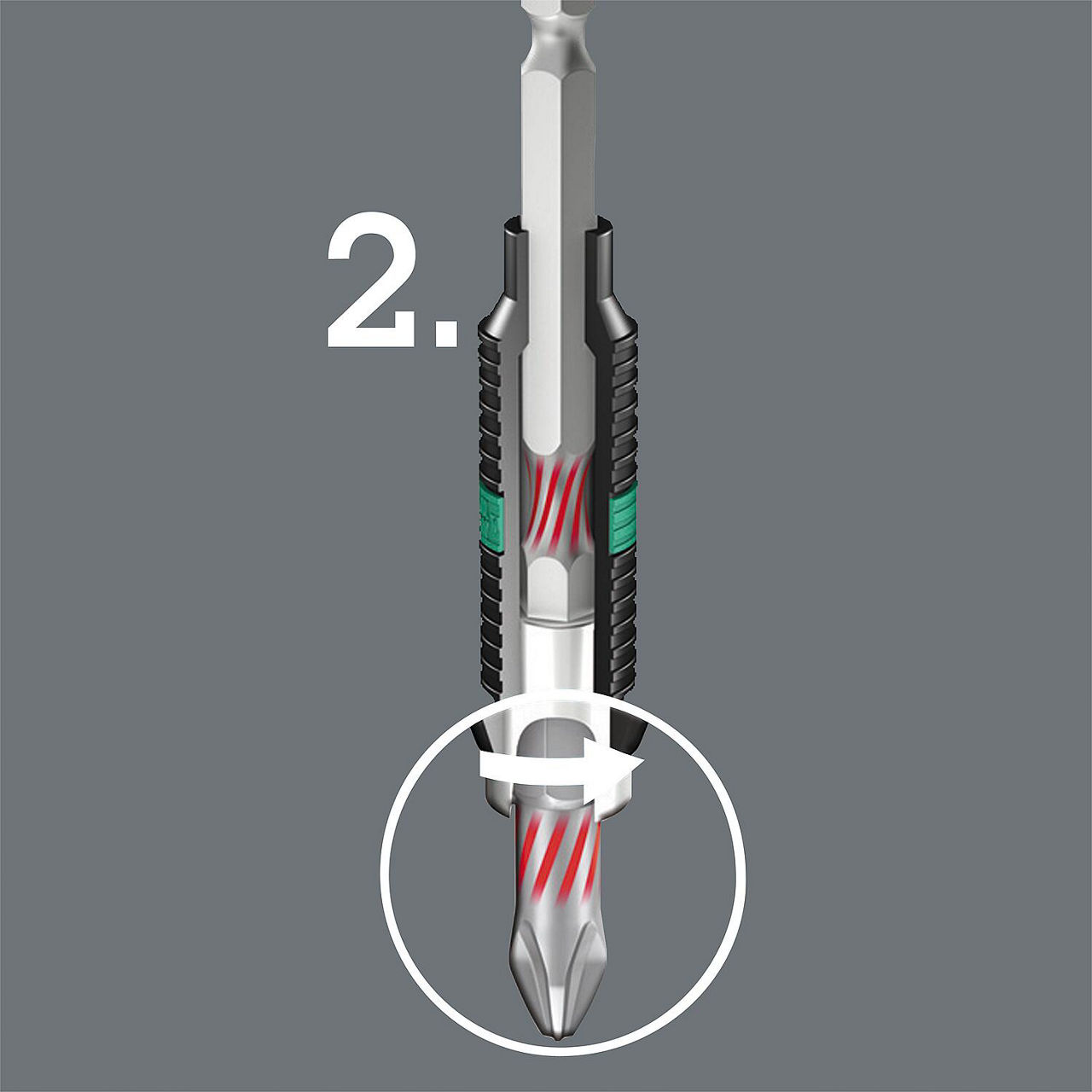 - Die elastischere BiTorsions-Zone federt hohe Belastungen ab: die Verwindung der Bit-Spitze wird vermieden. In Verbindung eines BiTorsion-Bithalters entstehen zwei Torsionszonen um hohe und kleine Belastungsspitzen abzufedern.