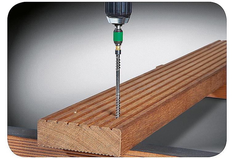 - Fixiergewinde: Fester Sitz des Holzbelags auf der Unterkonstruktion, garantiert sichere und dauerhafte Verbindung zweier Hölzer ohne Knarzen
